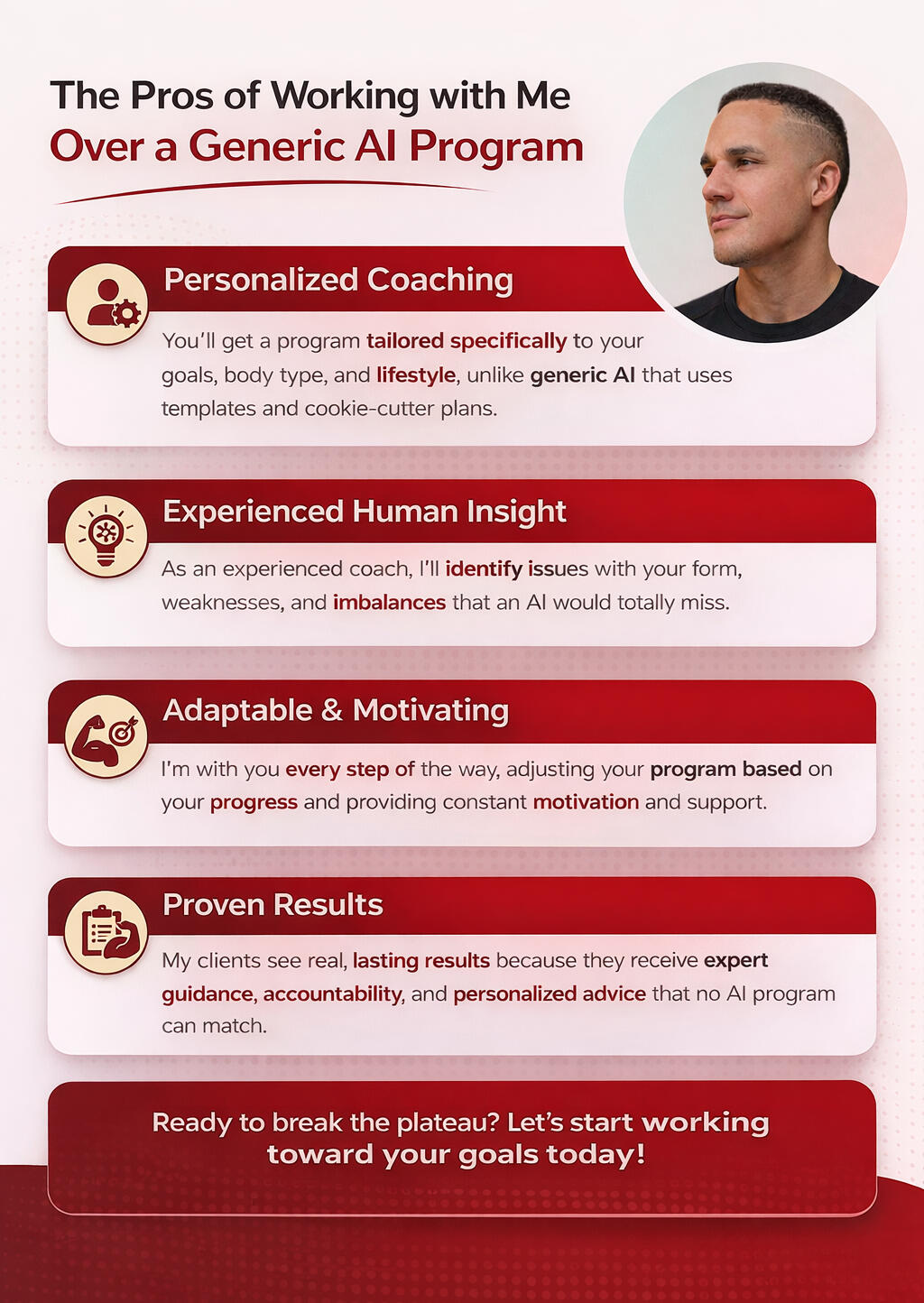The Expert Edge ChatGPT Can't Replicate: Form corrections, movement pattern analysis, load calibration — the things that make the difference between a workout that looks right on paper and one that actually changes your body. This is what 11 years of advanced study gives you.